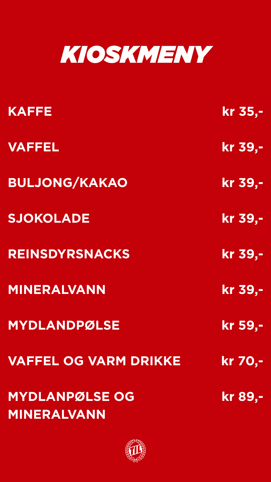 På helgens kamp er alle kioskene våre åpne og i disse finner du blant annet kaffe, sjokolade, Mydlandspølse og vaffel for å nevne noe.